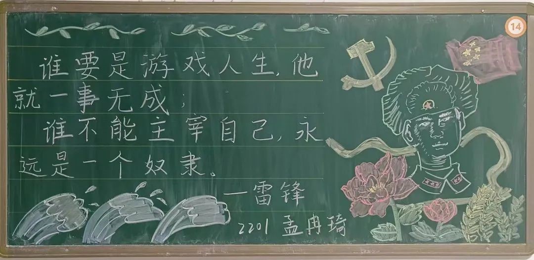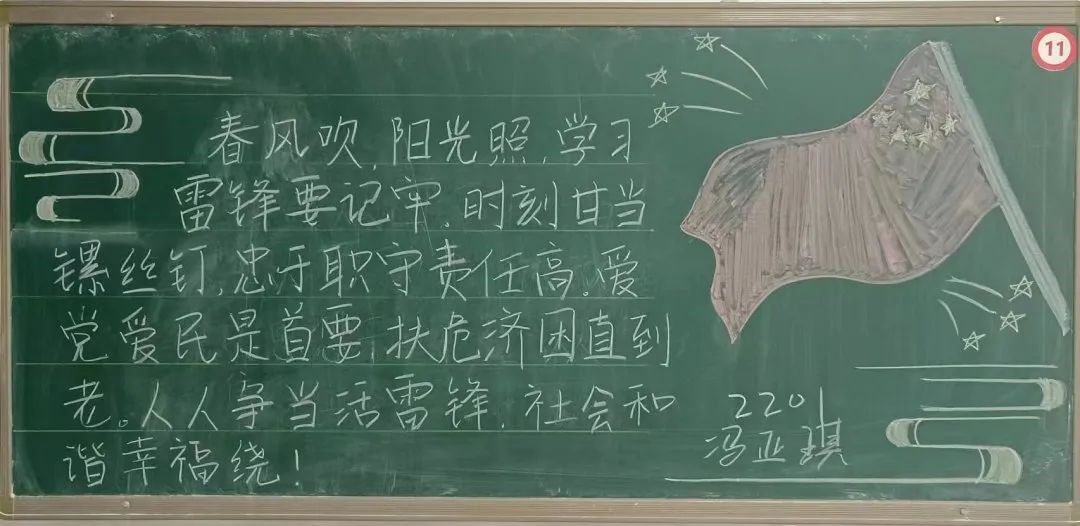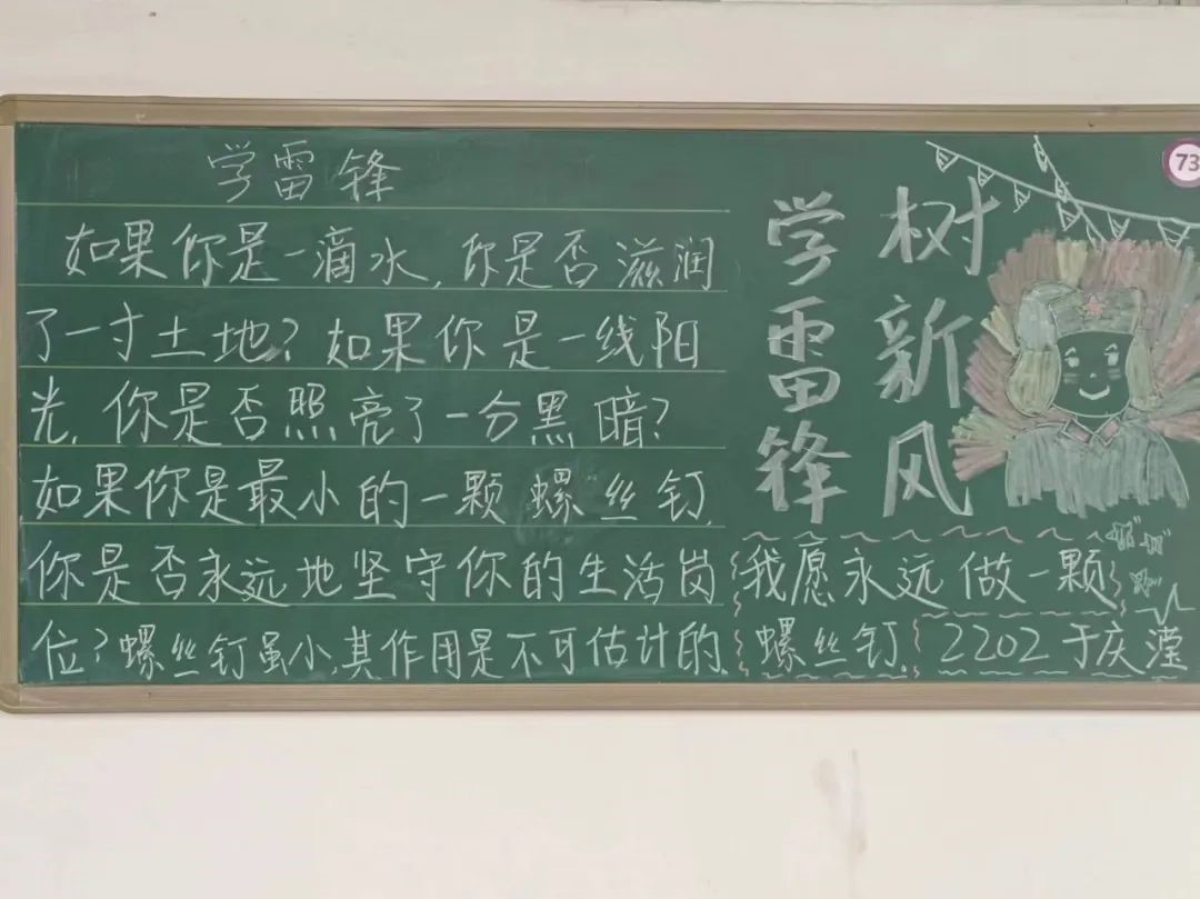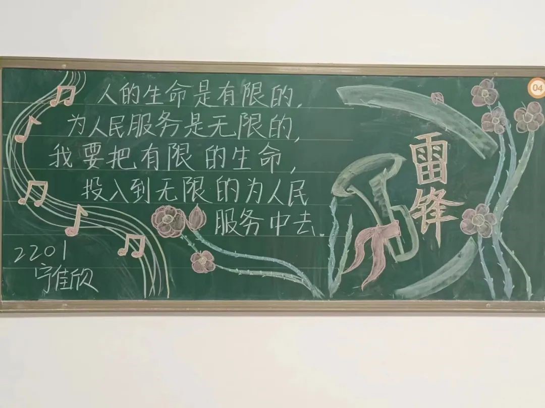 传承雷锋精神,争做文明先锋。同学们以雷锋精神为基调,从雷锋事迹,雷锋日记、雷锋语录等方面展现了雷锋精神的内涵与意义。板报图文并茂、主题突出,海浪、灯塔与行船等元素表现出雷锋精神多年来在各行各业的引领作用。红色的五角星镶嵌于板报中,表现出雷锋同志的党员身份,也体现出雷锋精神照亮人民群众的带头作用。