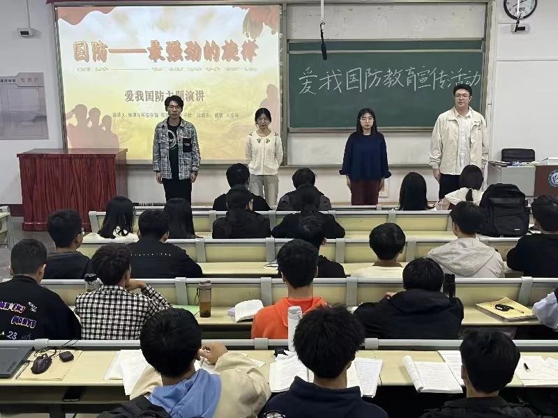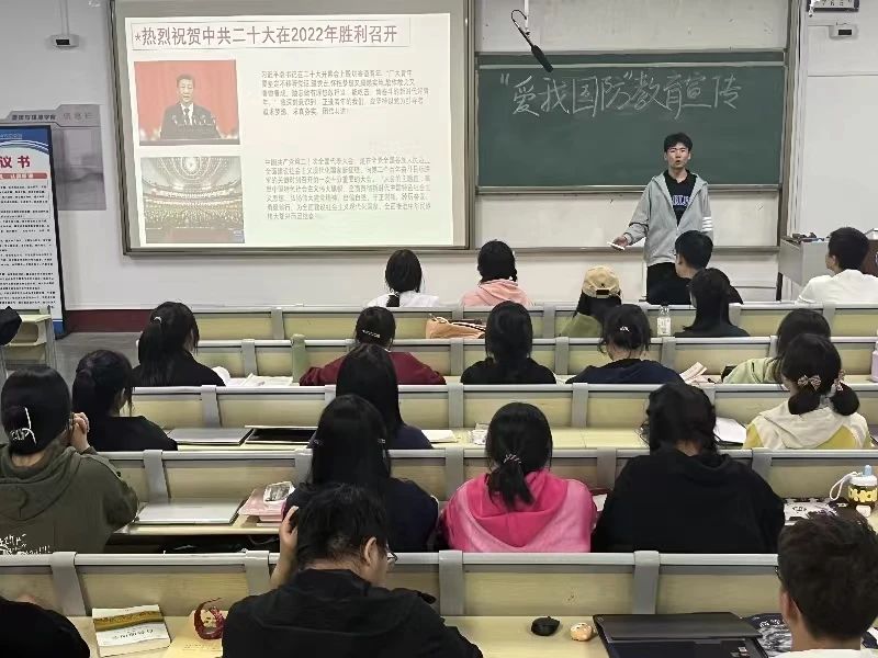 在慷慨激昂的背景音乐下,宣讲团成员深入浅出地为同学们阐述了建设强大国防的重要性,让同学们进一步认识到强国必须强军,军强才能国安。团队成员还向同学们宣传了国防教育的历史、国防知识科技、征兵政策等,让同学们对国防知识及相关法律法规有了进一步的了解。
