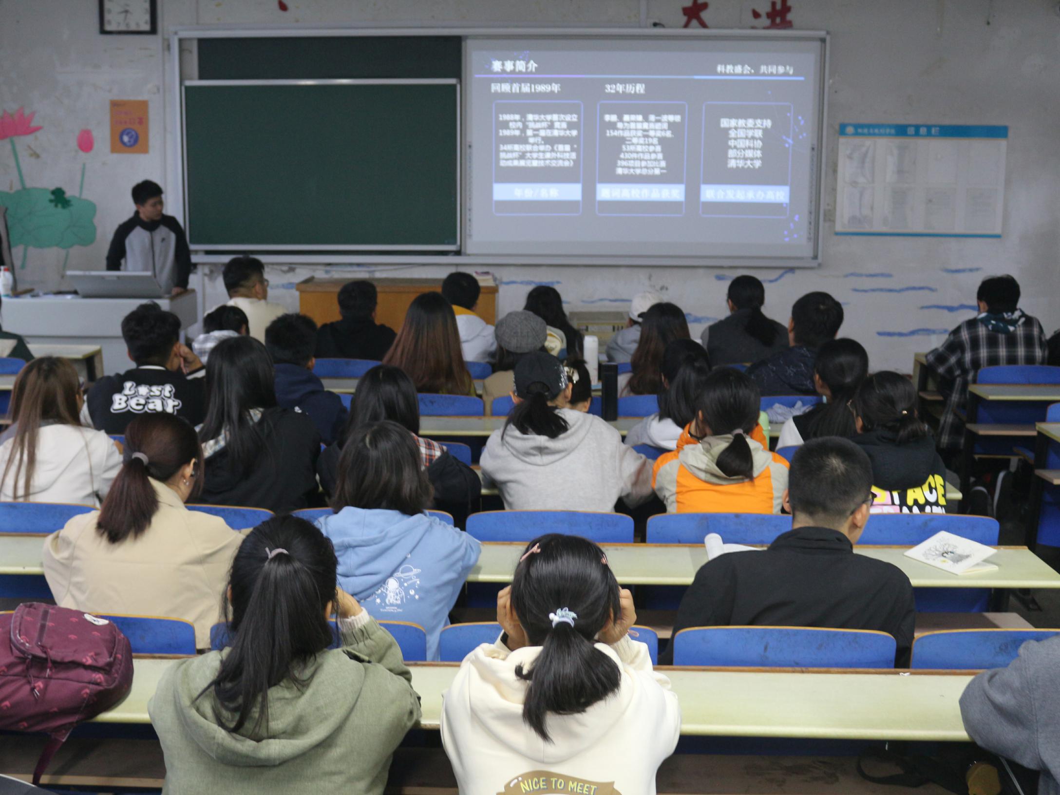 感受科创魅力,融入时代发展。在这次活动中,同学们踊跃报名。学生代表以“科创精神和时代发展”为主题,向同学们详细讲解了科技创新大赛中三大赛事之一的“挑战杯”全国大学生课外学术科技作品竞赛,重点宣扬了实事求是的品格和刻苦钻研、勇于创新的精神。学生代表分享了个人的工作任职情况、参赛的经验和启示,根据自己的实际情况向同学们讲述了如何做高质量的商业计划书,并根据参赛经历体会向同学们介绍了比赛的类别和流程、最佳的作品展示形式以及答辩技巧。最后,学生代表向同学们分享了个人科创心得和成功事迹,激发同学们对创新创业创造的热情,鼓励同学们积极参加比赛。同学们认真聆听,在宣讲中感受到了科创的魅力。
