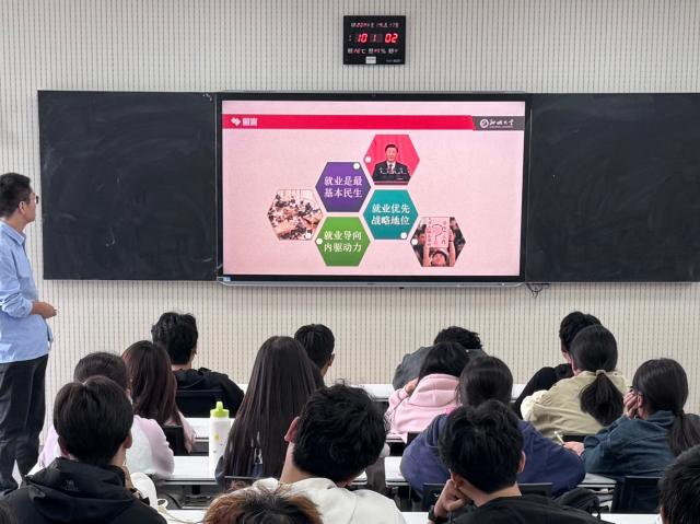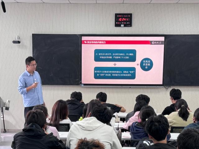 活动伊始,授课老师从就业是最基本的民生、就业优先的战略地位、就业导向内驱力形成三个方面讲述了大学生就业对社会、个人发展的重要意义,国家对于高校毕业生就业的高度重视,新生要从就业导向的角度形成驱动力促进个人全面发展。