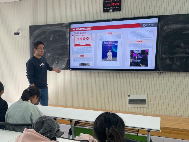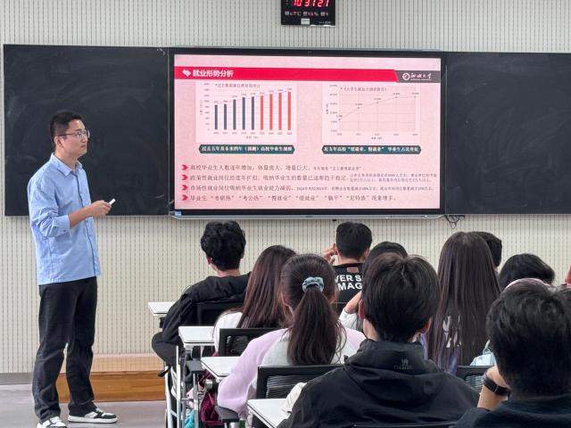 为了让同学们充分认识到当前大学生就业的形势,授课老师从国家经济发展、就业市场现状、16-24岁失业率等方面进行了深入分析,对于“高等教育普及化”、“以就业为导向的高考志愿填报趋势”、“如何正确的对待考研”等热点话题辅以实际案例进行了交流探讨,引导学生在当前严峻就业形势下科学、长远规划自己的就业目标。